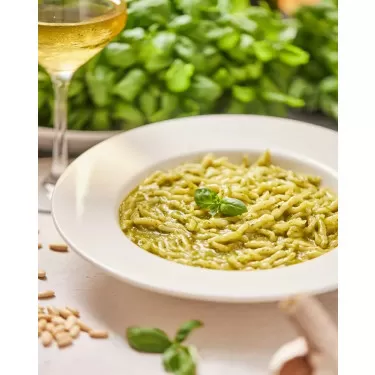 Ligurie (Liguria) se nachází na severozápadním pobřeží Itálie a je známá svými malebnými přímořskými městy, strmými útesy a voňavými olivovými háji. Tento region je bohatý na citroníky, vinice a pole s bazalkou. Zvláště proslulá je Ligurie svými kulinářskými specialitami, jako je světově proslulé Pesto Genovese, které se vyrábí z čerstvé bazalky, piniových oříšků, česneku, parmazánu a olivového oleje. Také Focaccia, tradiční ligurský chléb, a pokrmy z mořských plodů jako Trenette al Pesto jsou pro tento region typické. Ligurie nabízí dokonalou kombinaci moře, hor a vynikající kuchyně.